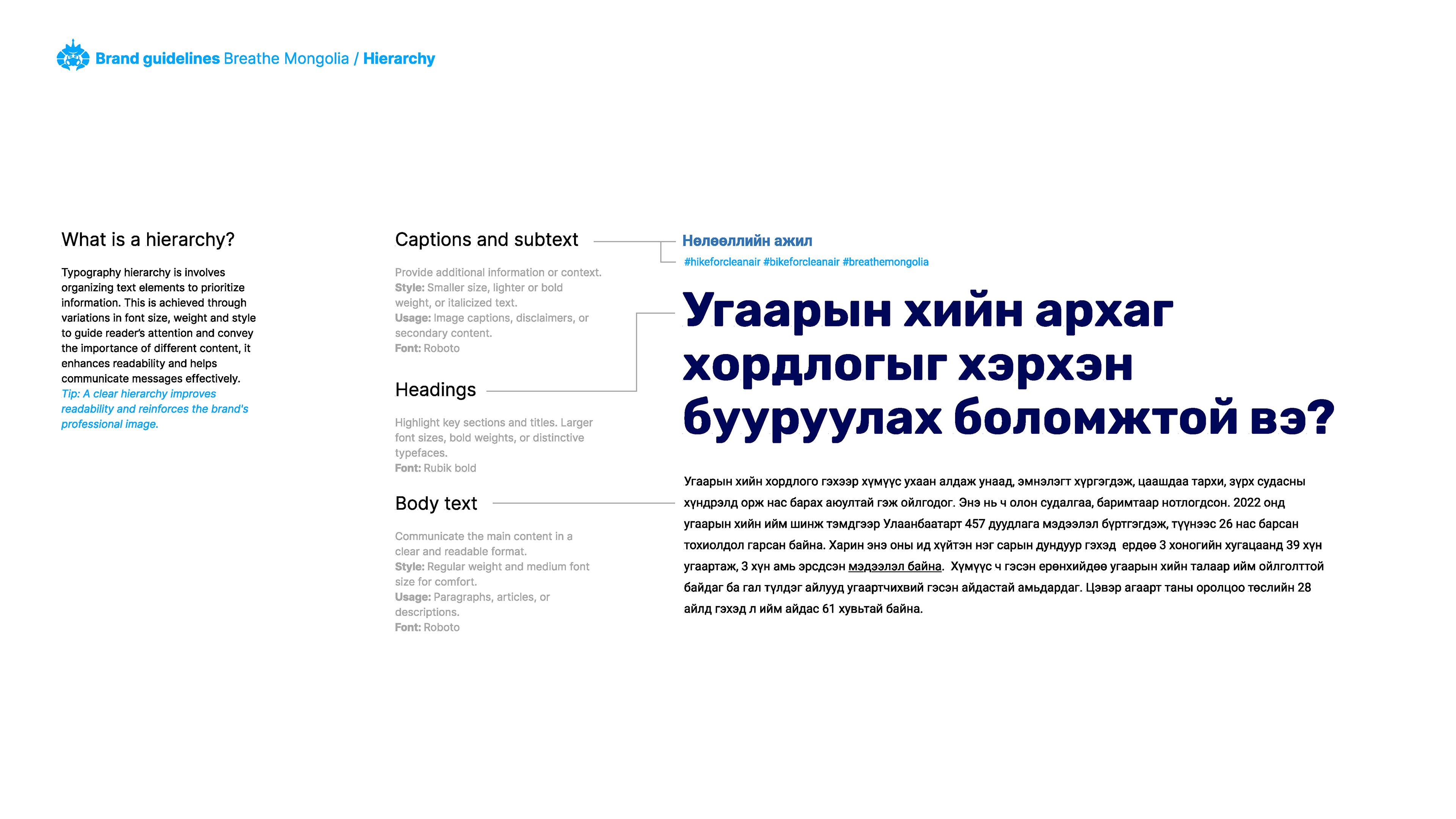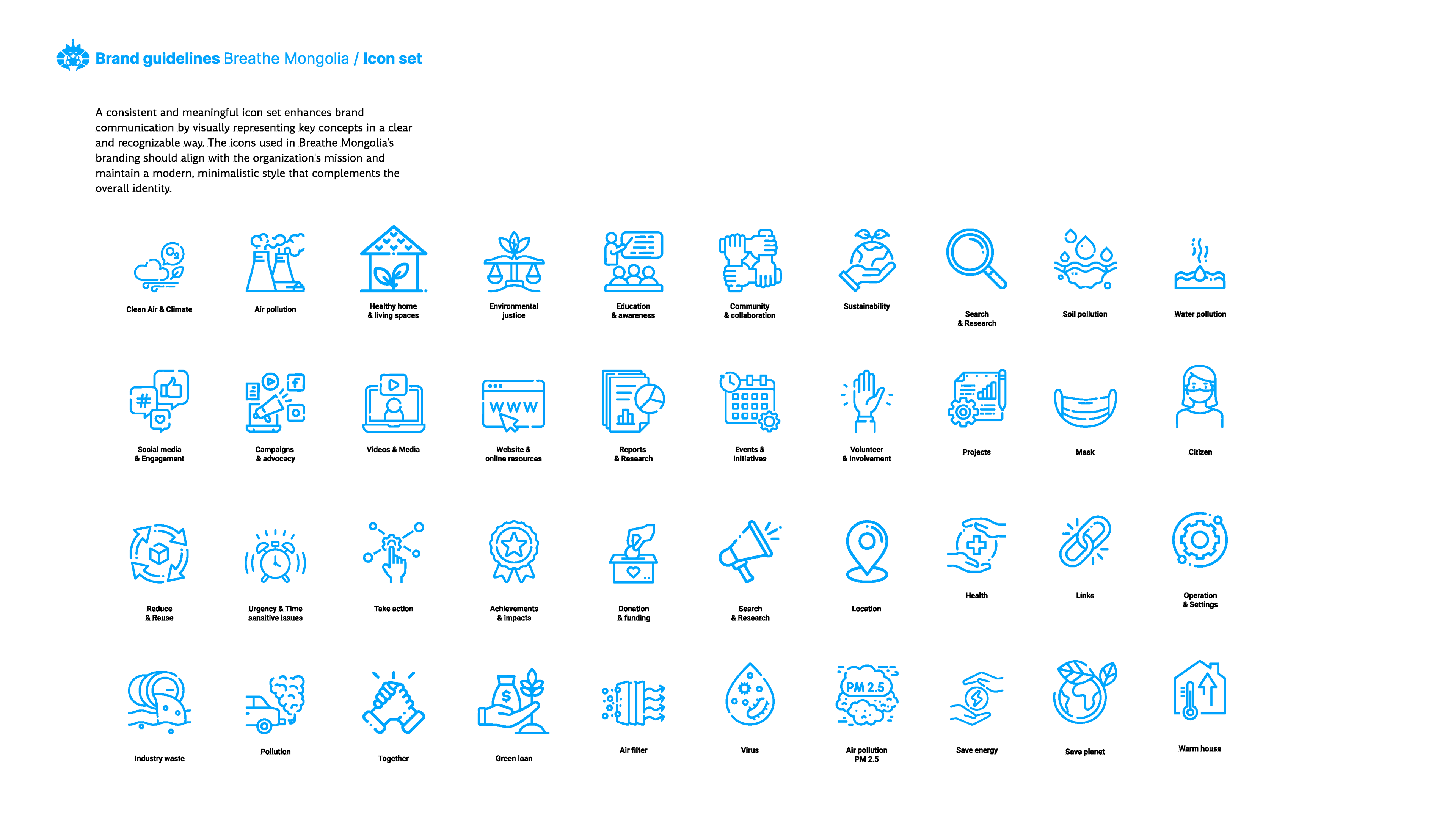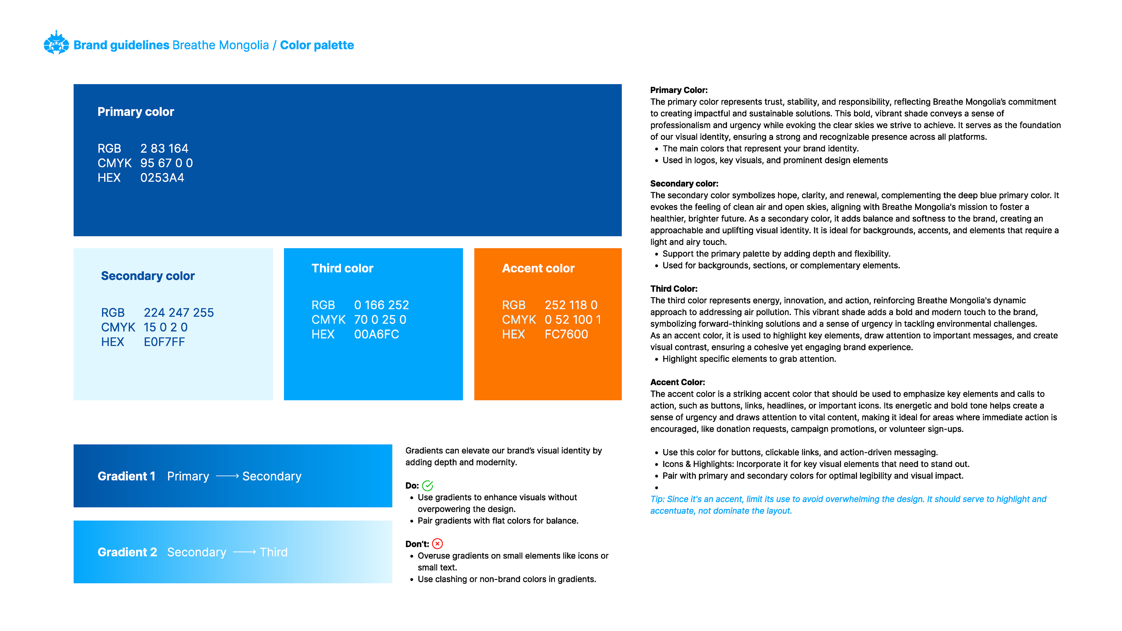 A strong, unified brand identity helps Breathe Mongolia communicate its mission effectively, engage stakeholders, and drive meaningful action. By crafting a visual system that is both modern and timeless, this guide supports the organization’s long-term impact.