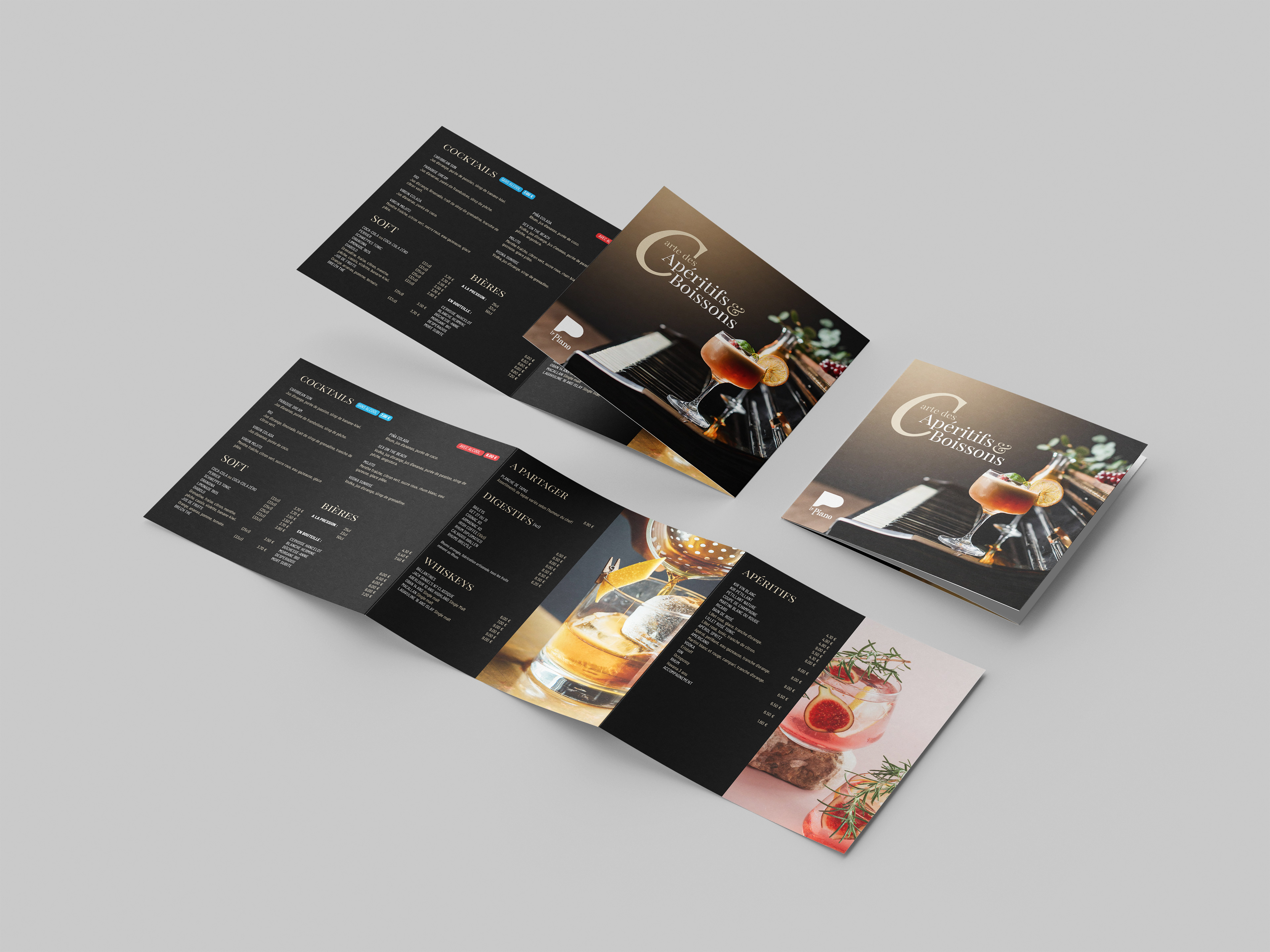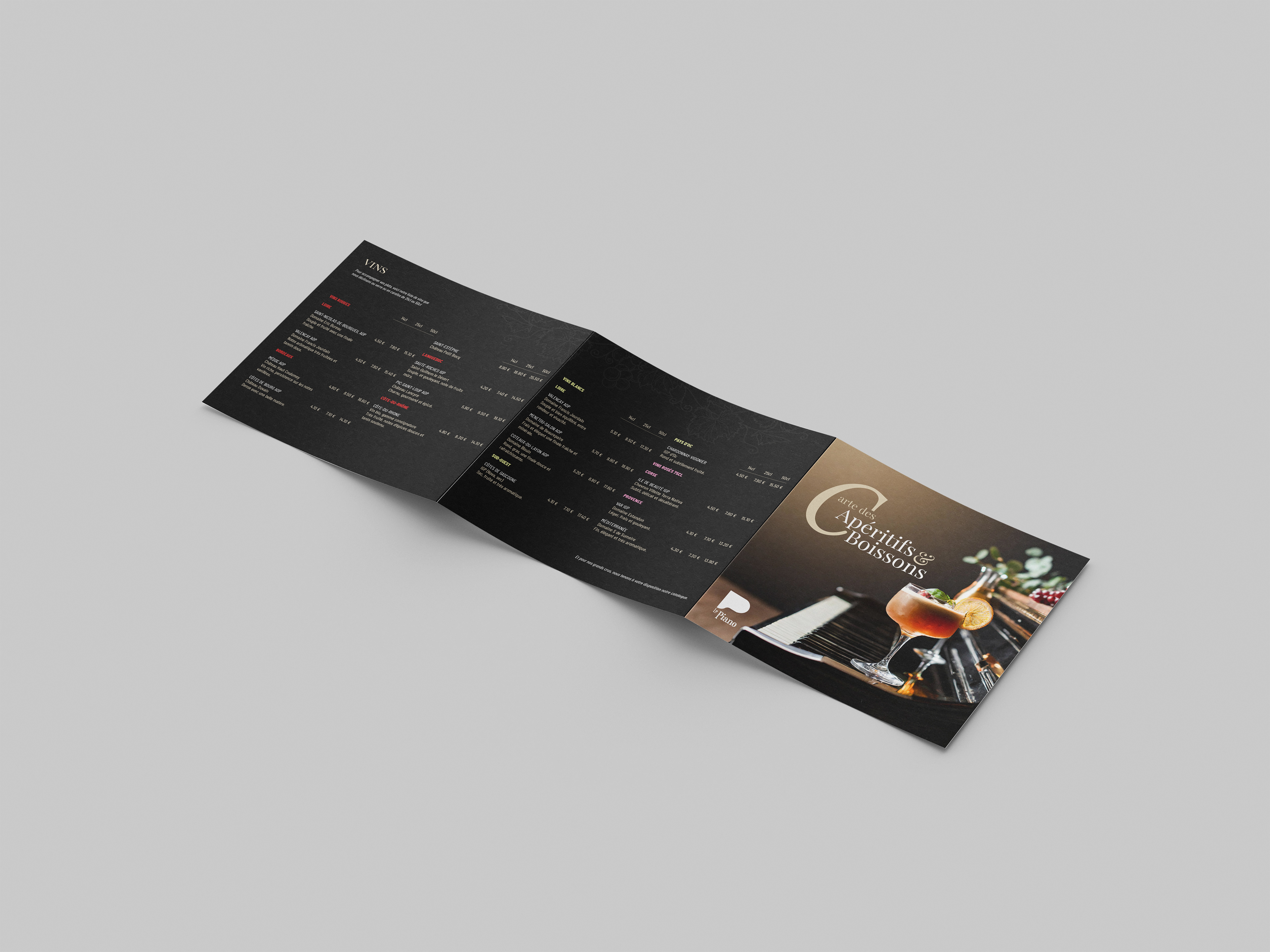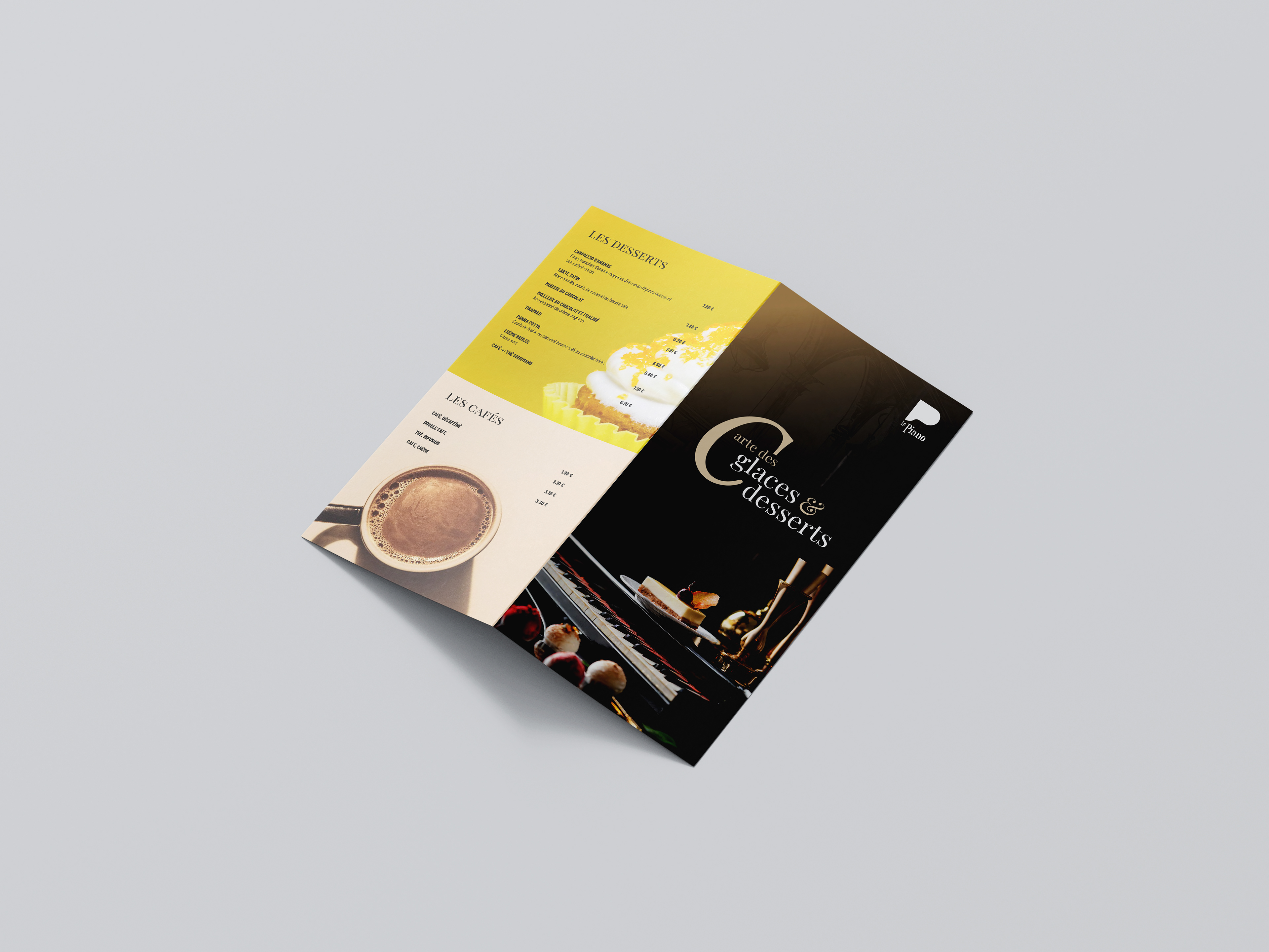 Le design de la carte de LE PIANO est une fusion harmonieuse de l'esthétique classique et contemporaine, reflétant ainsi l'atmosphère élégante et raffinée du restaurant. Des typographies élégantes aux illustrations délicates, chaque élément graphique a été soigneusement sélectionné pour créer une expérience visuelle cohérente et captivante.